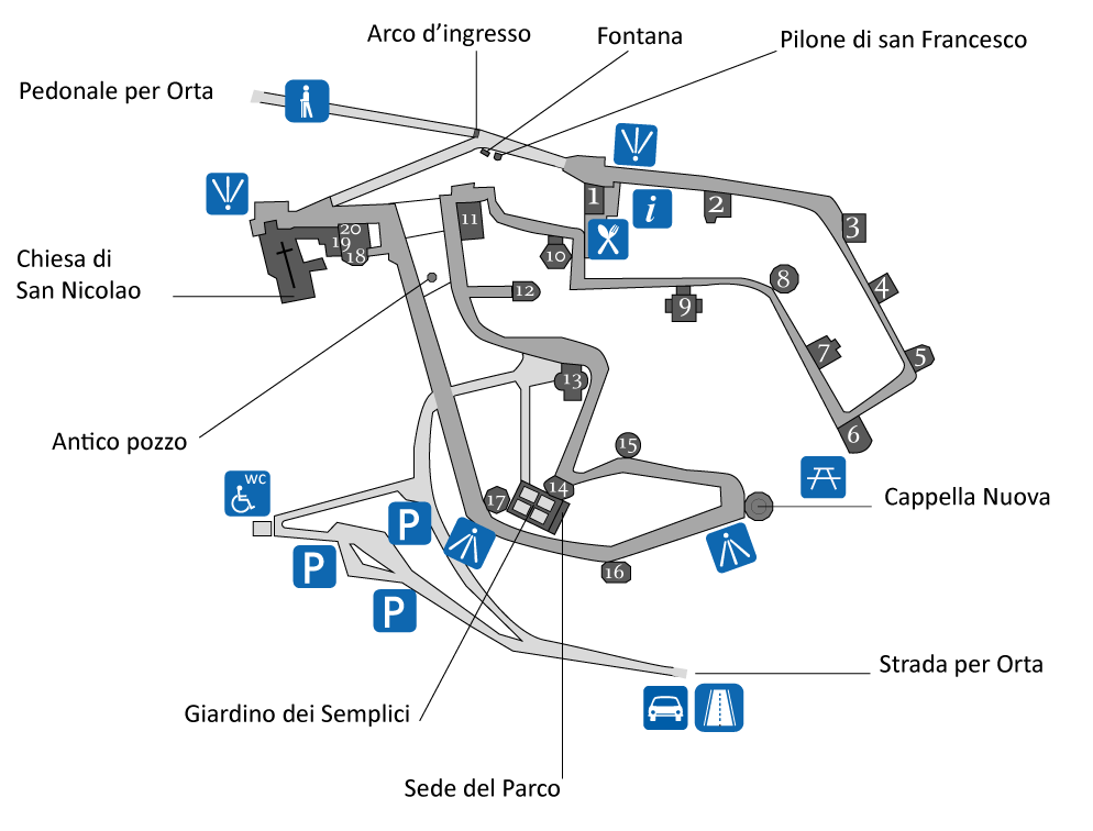 Buses and campervans are not permitted to access the Sacro Monte car parks; they may park along the road to Orta, where there are dedicated parking spaces.